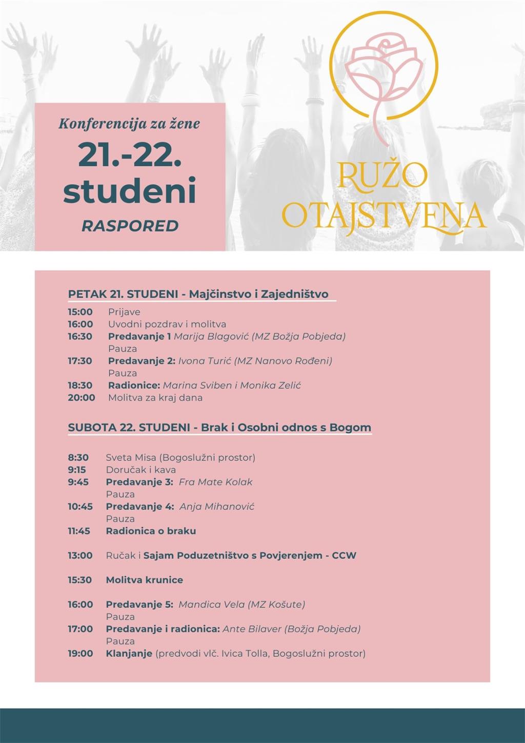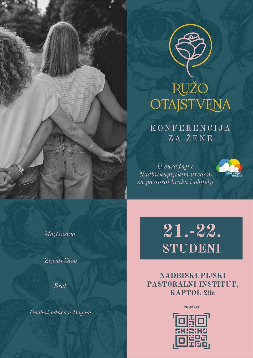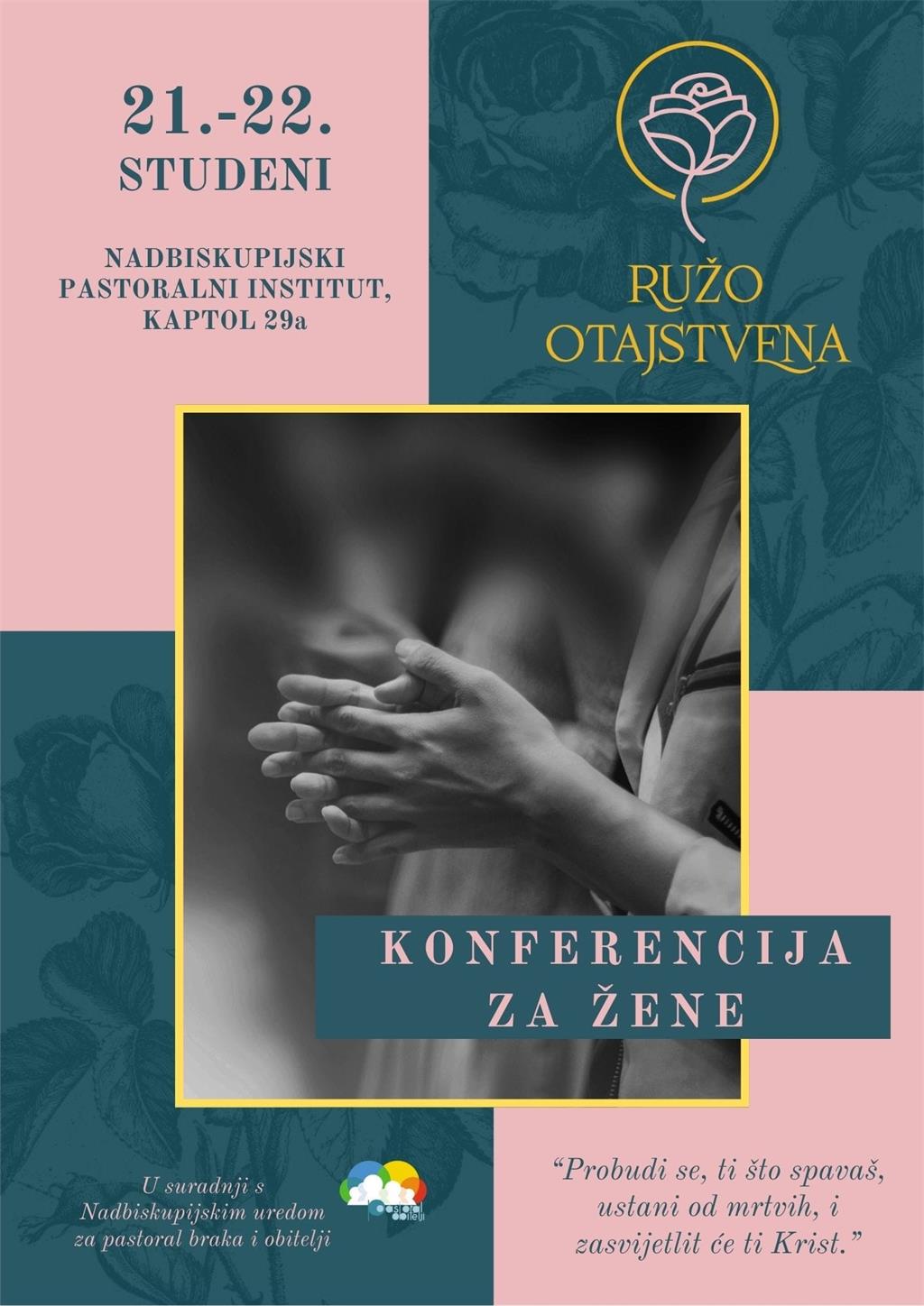 U Nadbiskupijskom pastoralnom institutu (Kaptol 29a) 21. i 22. studenog 2025. održat će se Konferncija za žene "Ružo otajstvena" u organizaciji Ureda za pastoral braka i obitelji Zagrebačke nadbiskupije.